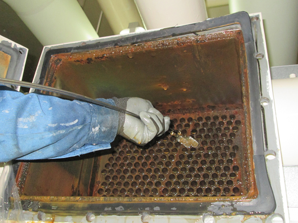定期的な洗浄や、スライムなどの軟質汚れにはブラシ洗浄がお勧めですが、長年の蓄積により、固着した汚れ(硬質スケール)には、薬品で汚れを溶解する薬品酸洗浄がお勧めです。